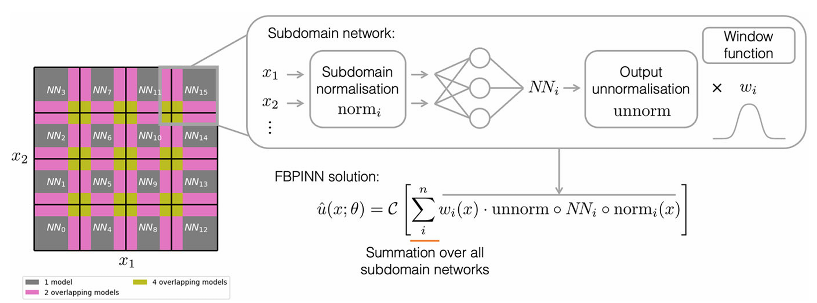 在FB-PINN中,问题域$\Omega \subset \mathbb{R}^d$被细分为$n$个重叠的子域$\Omega_i \subset \Omega$,子域的细分可以为任意类型,规则或不规则,且可以有任何重叠宽度(但子域之前有重叠是必须的)。简单起见,我们展示一种规则细分(超矩形划分):