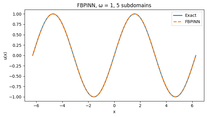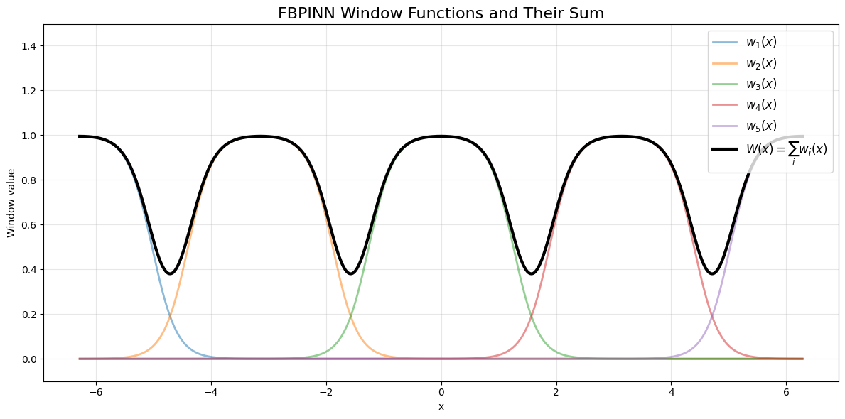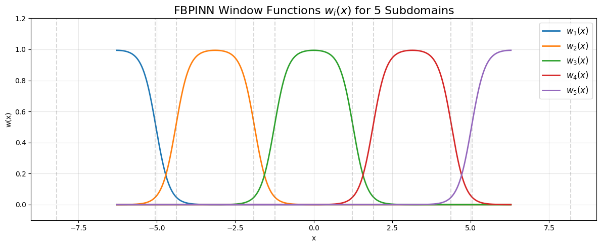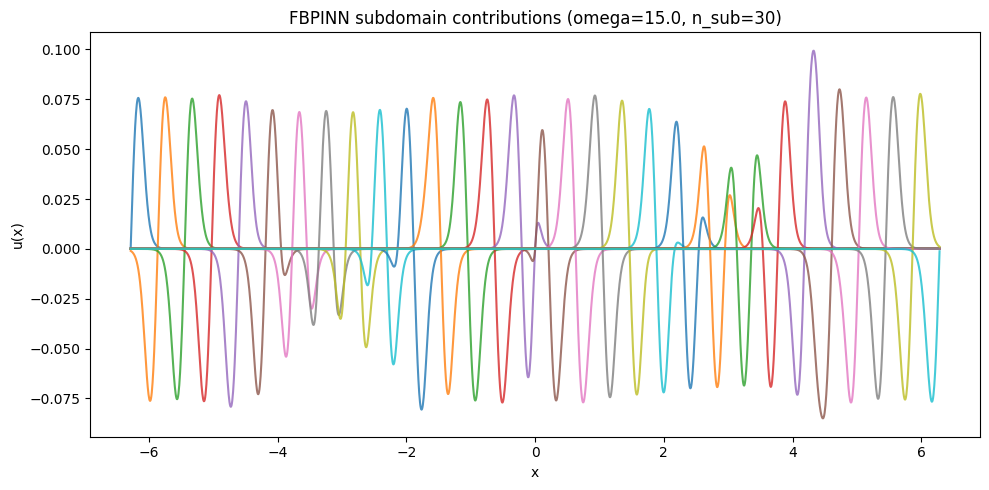 在低频情况下,域$x \in [-2\pi, 2\pi]$被划分为$n=5$个重叠子域,每个子域之间的重叠区宽度为1.3。为了获得5个子域,我们首先将计算域分为5个等距点: