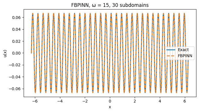 对$\omega$为15时,我们构造30个子域,重叠宽度为0.3,同样采取2个隐藏层,每层16个神经元的简单网络,残差点扩充为3000,训练次数扩充为10000 epochs: